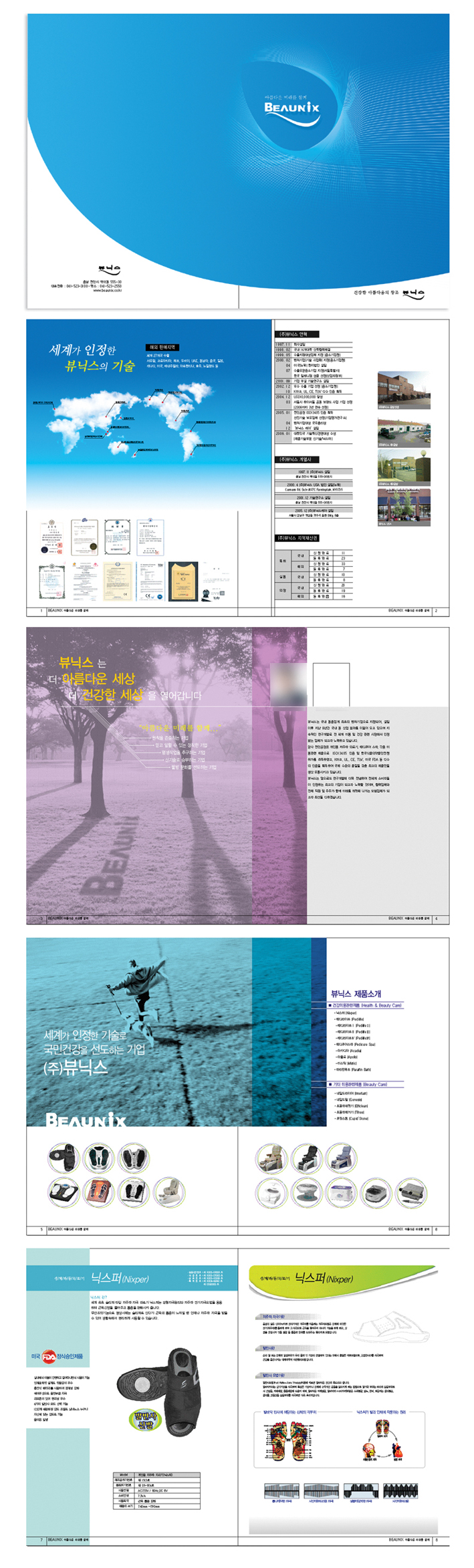 우리의... 소원은... 통일~ 꿈에도... 음;;; 표지 뒷면에 주소부분이.. 하단왼쪽위치에 오른쪽정렬이라는게 좀 걸립니다.; 1p에서 2p로 넘어가는 그라데이션 끝에 걸린 두선이 답답해보여요; 1p를 2p까지 침범 안하는 선에서 마무리하시고 2p에 표오른쪽 붙은 선을 떼어주시는게 좋을듯합니다; 왼쪽만막혀있으니 세로선을 안넣은 의미가 없어지는듯;; 3~6p는.. 같은느낌으로 가실 의도시면 레이아웃을 좀더 통일시키는것이 좋을듯 합니다;; 7, 9p 왼쪽 바 뚫고 내용 넣으신 부분은 미색이라도 깔아서 바를 연결시키시는것이... 정리되 보일듯 싶구요....(아니면 다른제품설명페이지와 같은 레이아웃으로...) 13~14p는 좌우가 바뀌었으면 더 보기 편할듯 합니다;; 제품설명부분 밑에 넣으신 그라데이션은... 풀로 채우시거나 빼시는것이.. 시원해 보일듯하네요 ;; 이상 주제넘은.. 지극히 주관적인 -_-;; 공허생각 이였습니다;; 불쾌하셨다면 죄송합니다(__)